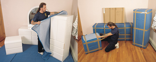 نبدا اولا بفك الأسرة و المكاتب و خزائن الملابس وغيرها من الاثاث وجعلها قطع ثم نقوم بلفها بالكرتون المقوي و شرائط البلاستيك الاصقة وفي حالة وجود بروز في قطع الاثاث نقوم بوضع الفوم عليها لحميتها من الخدوش و الخبطات و الحتكاكات اثناء النقل .